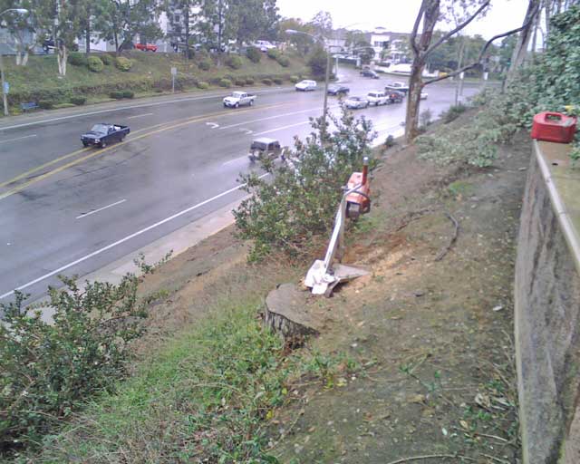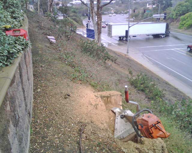 This stump is on a steep grade next to a wall. An easy job for the Alpine Magnum Stump Grinder.