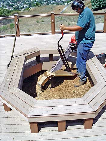 Grind stumps out of planter boxes next to buildings. | This tree had a deck built around it and our stump grinder was the only one that could grind the stump. |