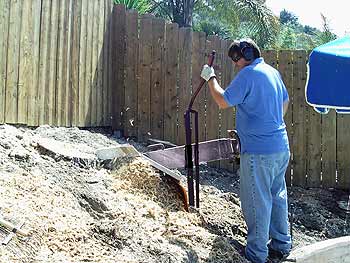 This stump location was above a pool and behind a fence. Our stump grinder was easily hand carried directly to the stump site. | This view is opposite to the picture on the left and shows how steep the bank is and how easy our stump grinder is to operate in these conditions. |